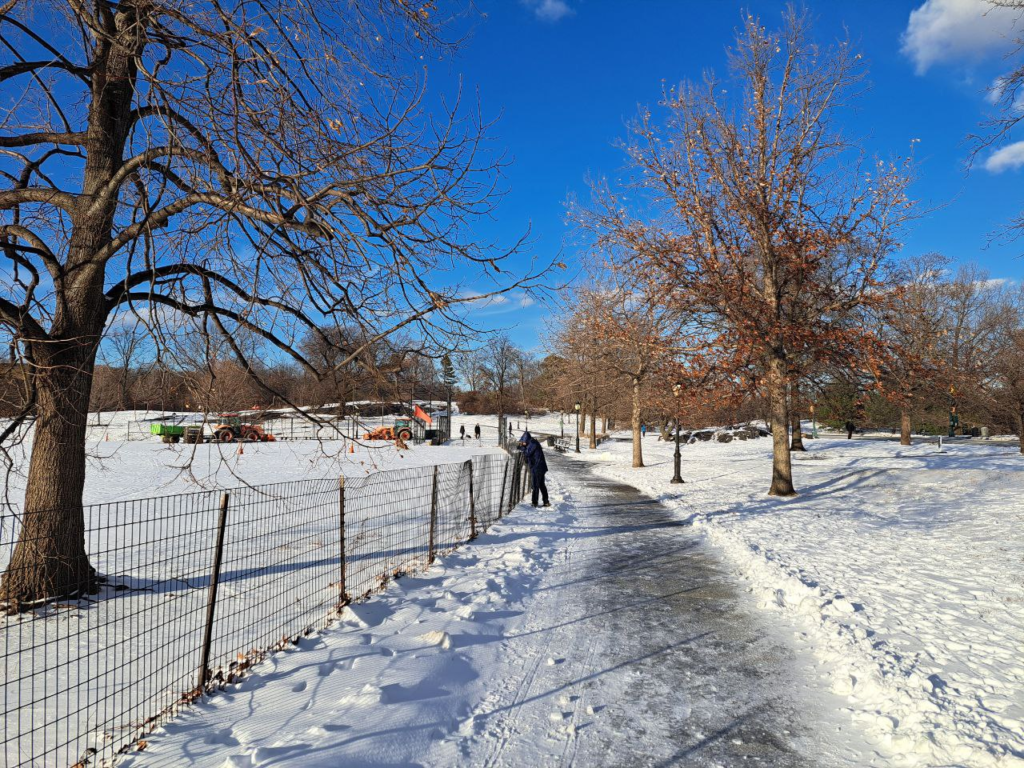 The core of my time has been spent between my oddly-laid out apartment, perched loftily above Morningside Park, Columbia University’s neoclassical, and 125th Street’s A/B/C/D subway, from which I am whisked to Midtown via rattling metal car in a matter of minutes. More on Columbia’s oddities to come in later weeks, although I fear I lack the time and authority to explore its subterranean labyrinth. The overworld has been magical. Yesterday, between snatches of fitful jet-lag naps, I glimpsed flurries of snow illuminated against the dull brown brick of my neighbour’s; today, all was caked in white. Joined by my friend Athé on a little jaunt to Central Park, we traipsed across fields, passing gormless squirrels failing to break frozen ground, dogs with powdery snouts, and inconsistently-frozen lakes. To debrief: hot chocolate in a café right on 110th, adhering formlike to a pub while lacking its spirit.